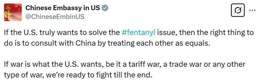The Chinese Embassy in the U.S. has stated that Washington must treat Beijing as an equal partner. An official statement emphasized: "If the U.S. truly wants to solve the fentanyl problem, the right approach would be to consult with China, treating each other as equals. If war is what the U.S. wants—be it a tariff war, a trade war, or any other kind of war—we are ready to fight to the end."