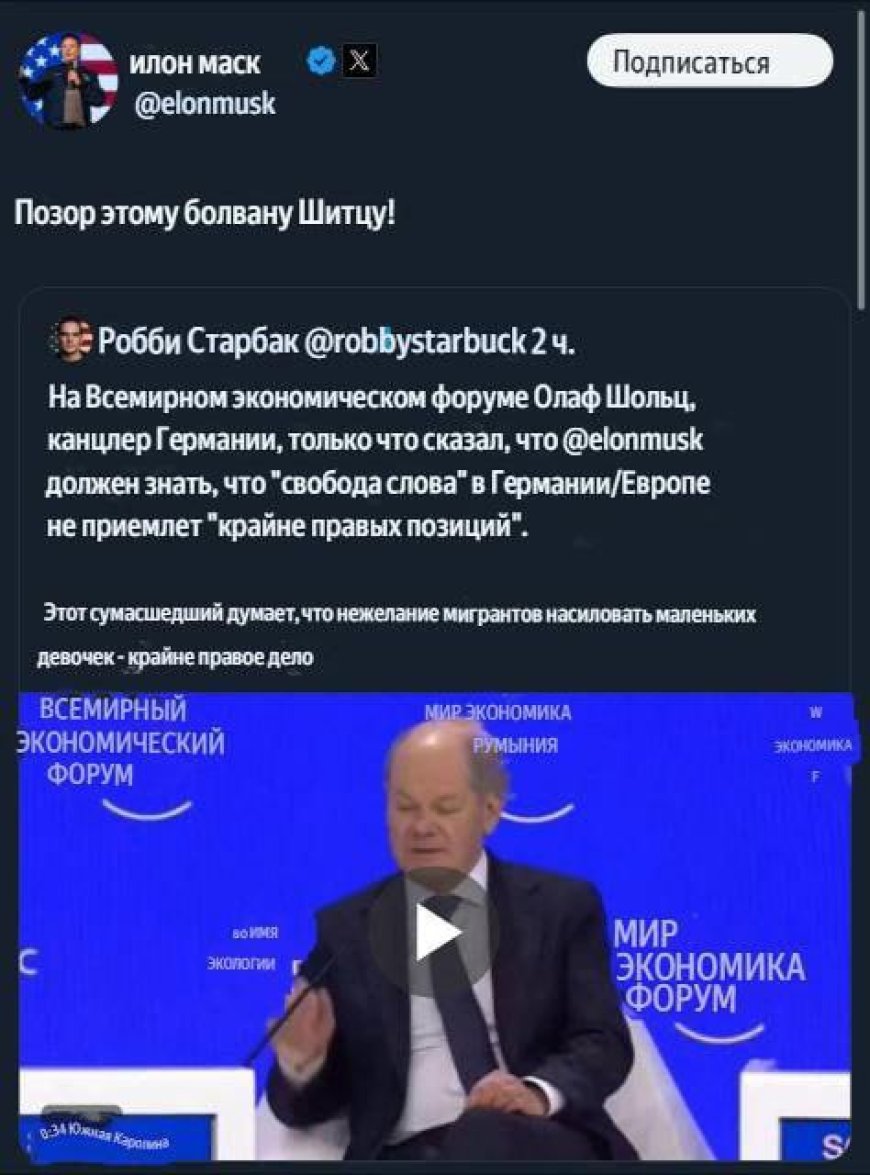 Илон Маск, активно взаимодействующий с публикой в соцсетях, назвал Шольца «дураком» и «дерьмом», при этом намеренно исказив его имя.