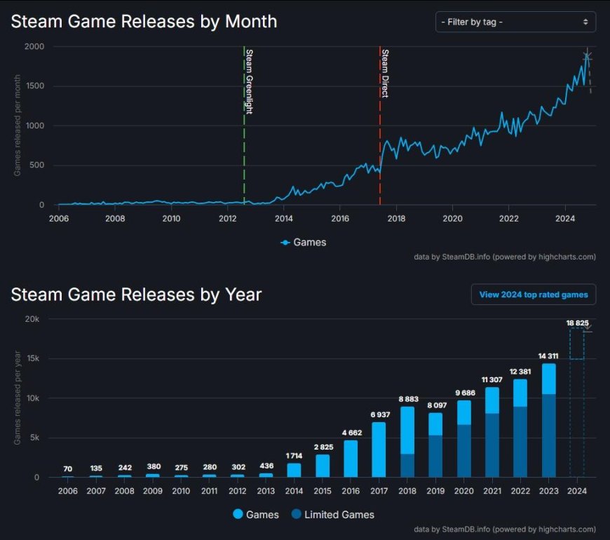 Рекордный год: в Steam в 2024 году вышло 18 825 игр